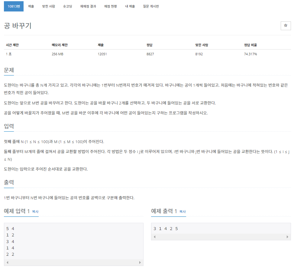 4단계 1차원 배열 6단계 10813 공 바꾸기 문제입니다