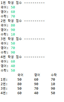 System.out.println(j+1 + "번 학생 점수 ----------");