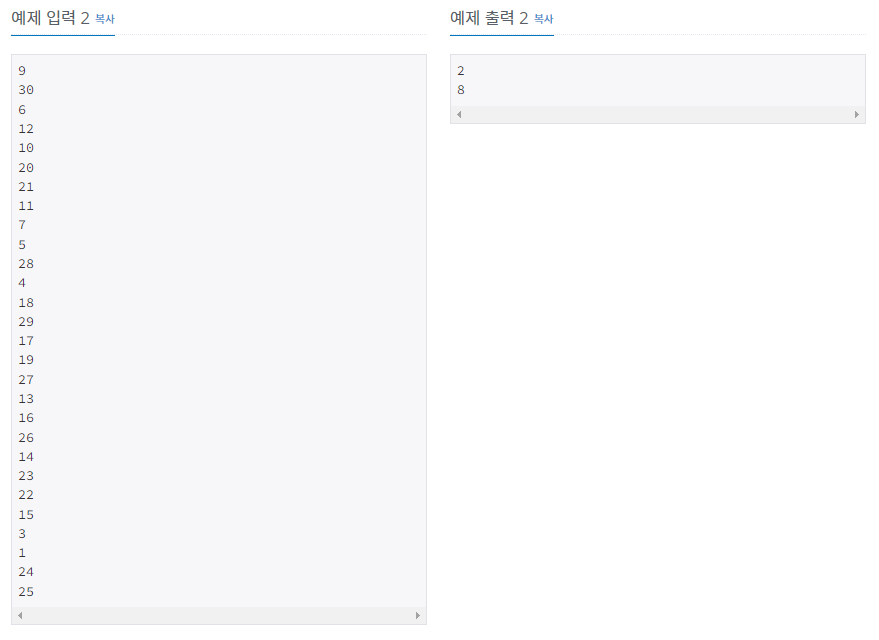1번째 줄엔 제출하지 않은 학생의 출석번호 중 가장 작은 것을 출력하고, 2번째 줄에선 그 다음 출석번호를 출력한다.