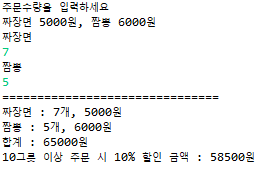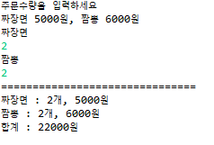 사용자에게 짜장면, 짬뽕 주문 수량을 입력받아 결제 금액을 계산하여 출력
