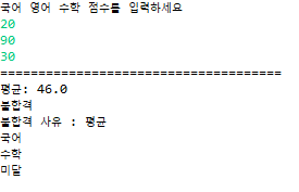 국어, 영어, 수학 성적을 입력 받고 평균 점수를 구하고,