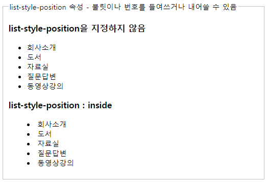 <legend>list-style-position 속성 - 불릿이나 번호를 들여쓰거나 내어쓸 수 있음</legend>