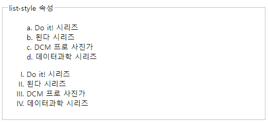 <legend>list-style-type 속성 - 순서 없는 목록의 불릿이나 순서 목록의 숫자를 바꾸는 속성</legend>