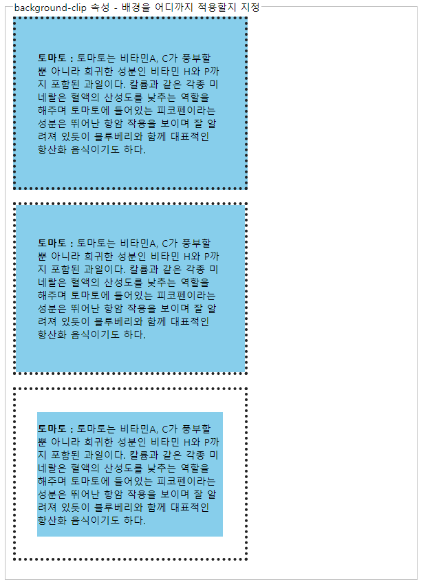 <legend>background-clip 속성 - 배경을 어디까지 적용할지 지정</legend>