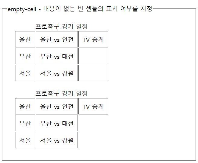 <legend>empty-cell - 내용이 없는 빈 셀들의 표시 여부를 지정</legend>
