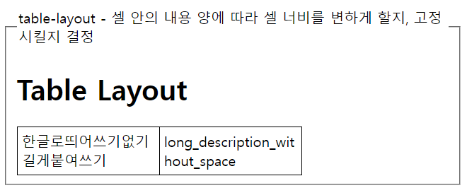 <legend>table-layout - 셀 안의 내용 양에 따라 셀 너비를 변하게 할지, 고정시킬지 결정</legend>