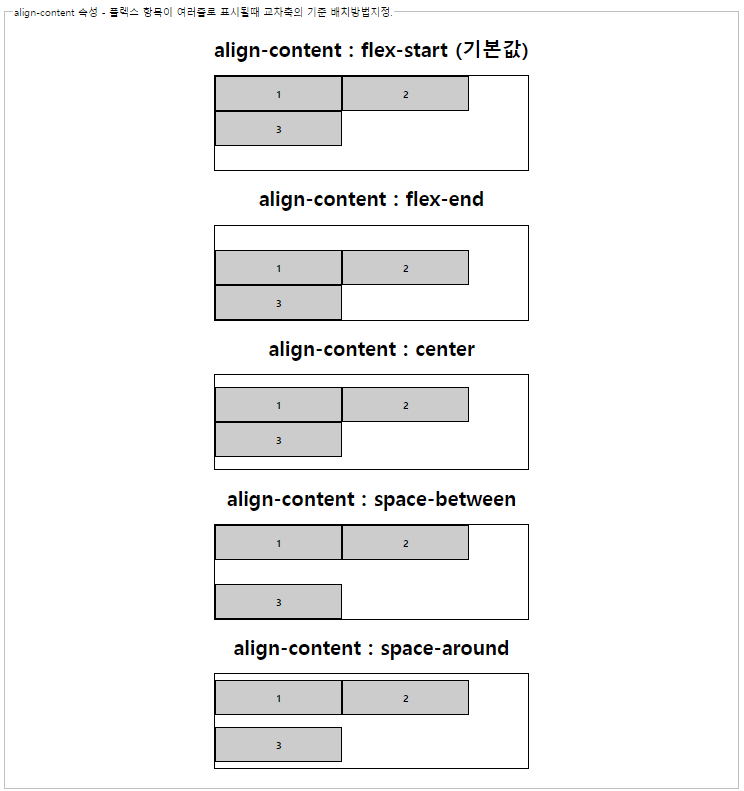 <legend>align-content 속성 - 플렉스 항목이 여러줄로 표시될때 교차축의 기준 배치방법지정.</legend>