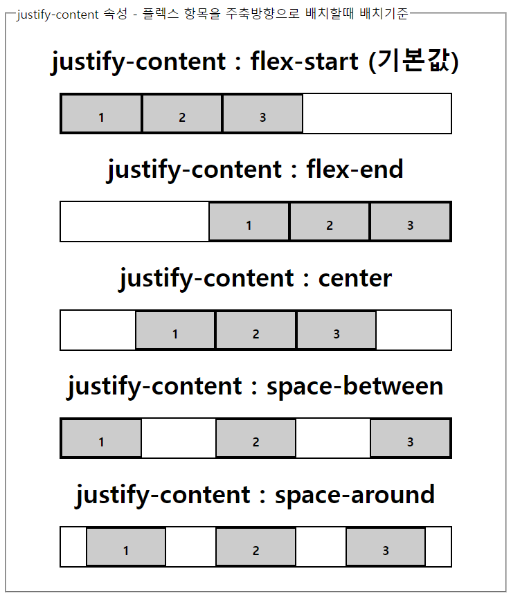 <legend>justify-content 속성 - 플렉스 항목을 주축방향으로 배치할때 배치기준</legend>