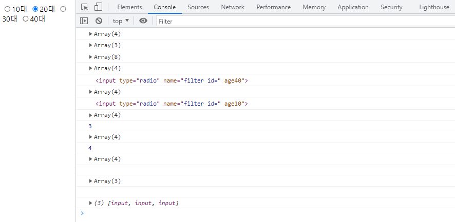 <label><input type="radio" name="filter id="age20" />20대</label>