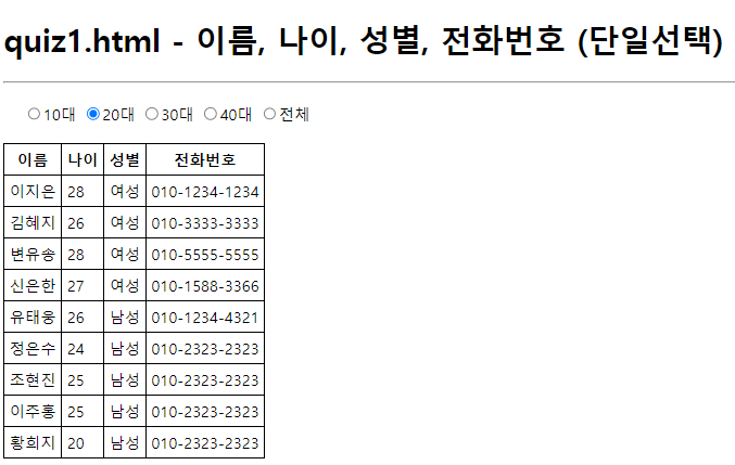 <h1>quiz1.html - 이름, 나이, 성별, 전화번호 (단일선택)</h1>