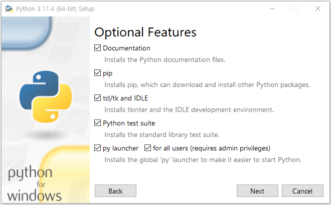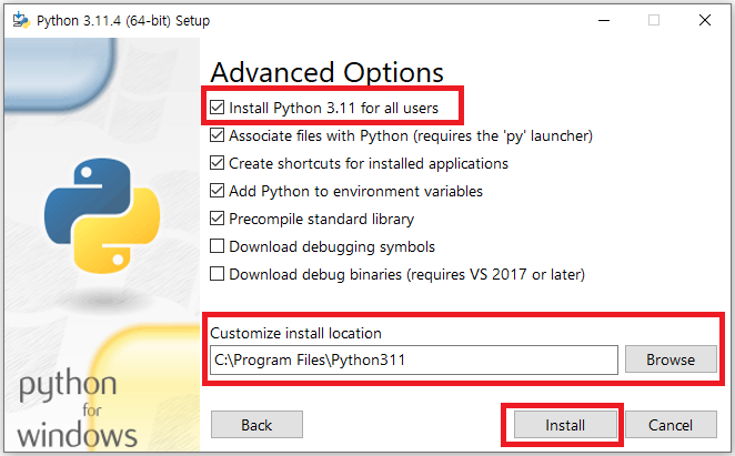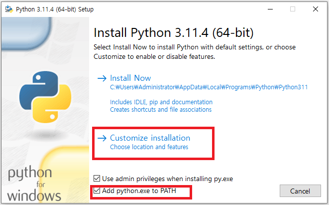 기본 세팅을 위해 Add python.exe to PATH 체크