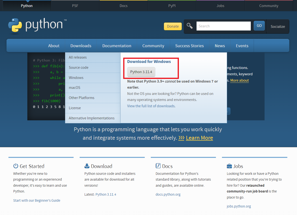 메인페이지 접속 > 다운로드 > Python 3.11.4 버전 다운로드