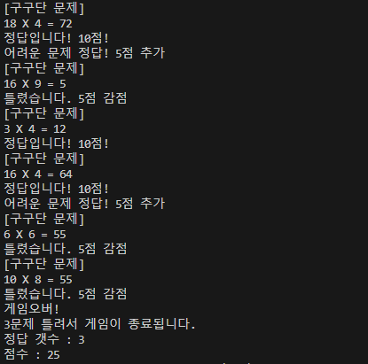 사용자가 3문제를 틀리면 게임오버! 라는 메세지를 출력한 뒤 종료