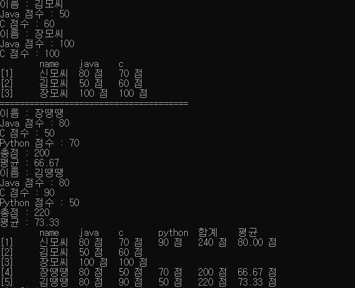(합계, 평균 등이 제대로 나오도록 아래의 객체를 생성 후 정보 출력)