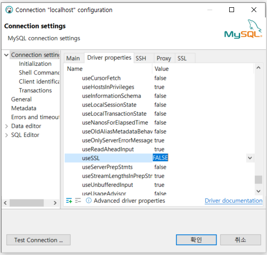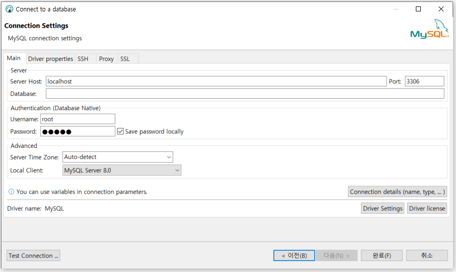 root 비밀번호 입력 후 Test Connection 버튼으로 연결 테스트