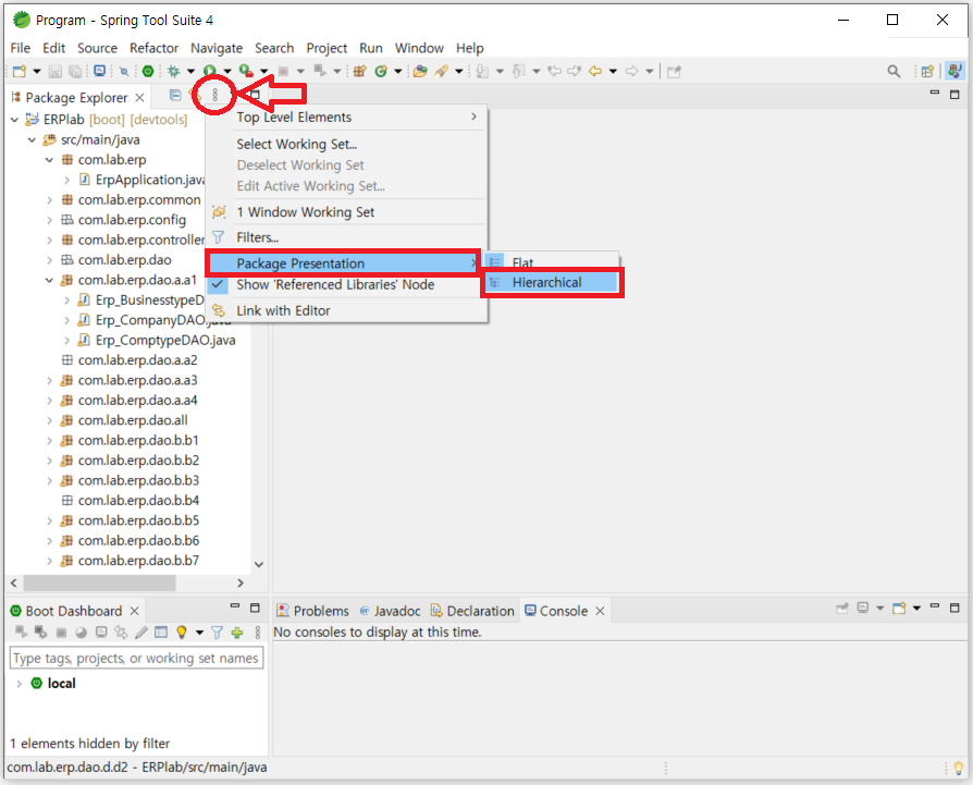 package explorer 오른쪽 모서리에 작은 동그라미 세 개가 세로로 늘어선 모양을 클릭한다