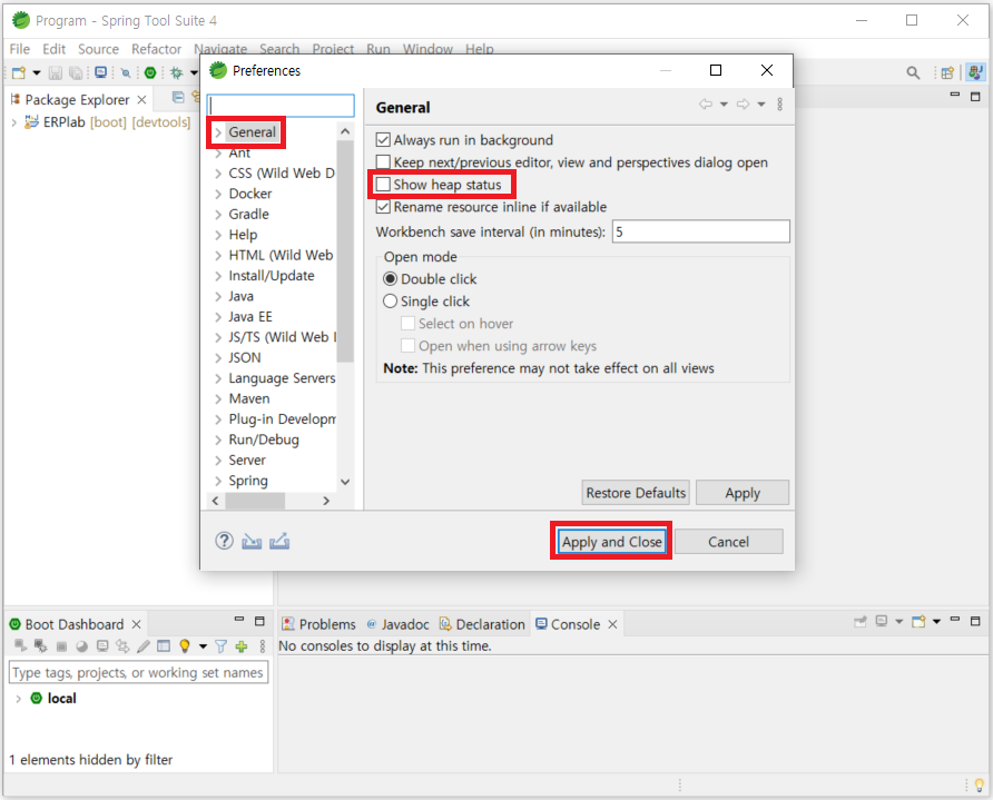 Show heap status 메뉴를 통해 메모리 상태를 확인할 수 있게 되는데