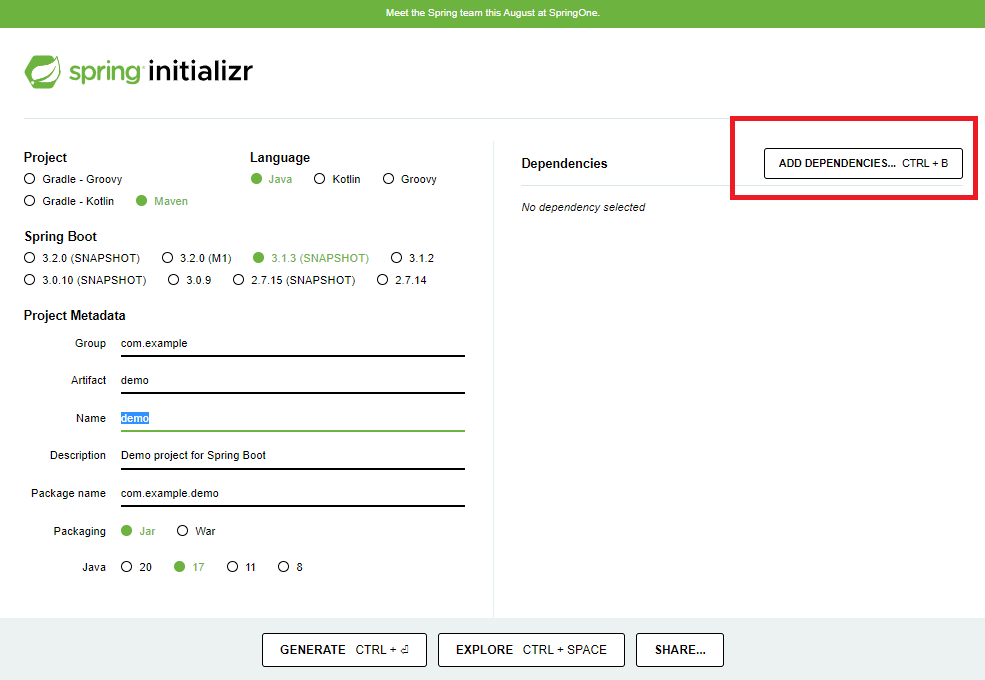 우측 상단의 [ADD DEPENDENCIES]버튼 클릭