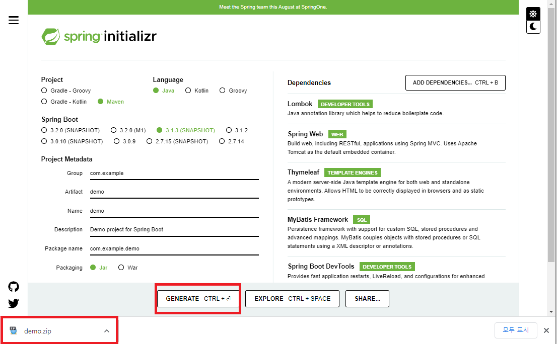GENERATE 버튼을 클릭하면 zip파일로 내려받기 가능