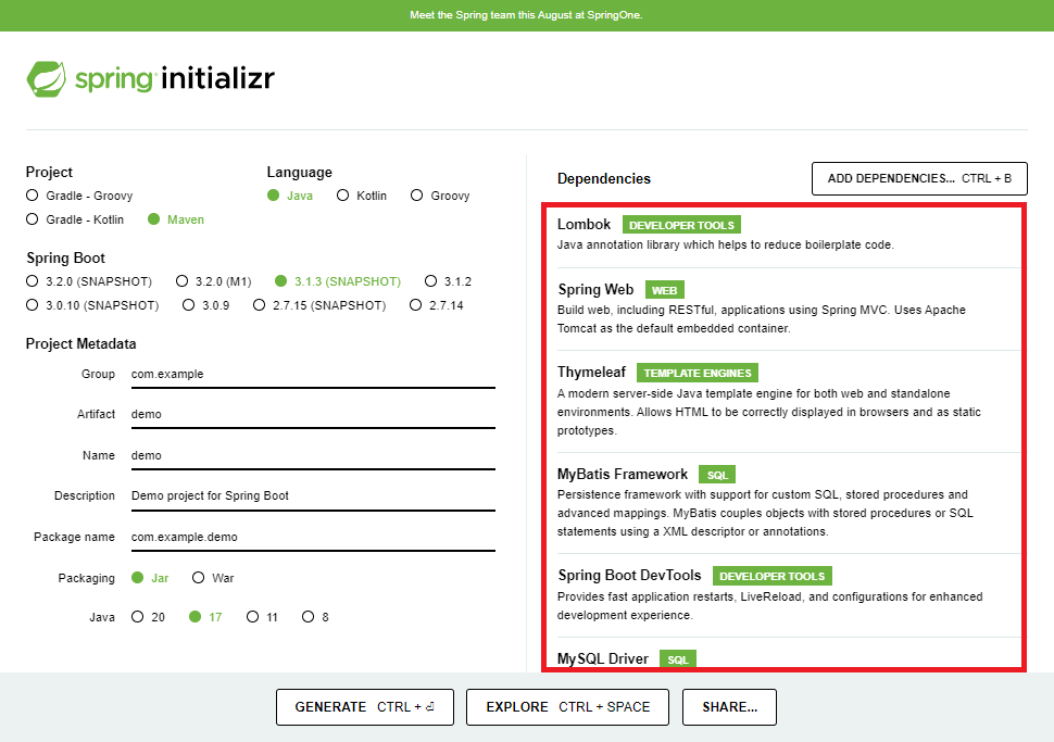 pom.xml에 dependency가 추가된 상태로 생성됨