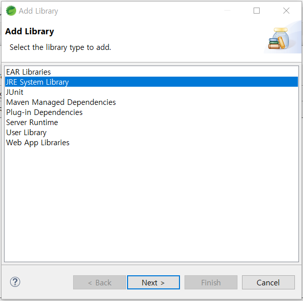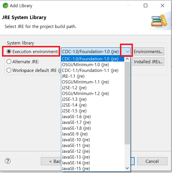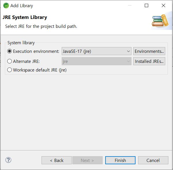System library > Execution environment > 아래화살표 버튼을 클릭해 올바른 버전 선택 > Finish