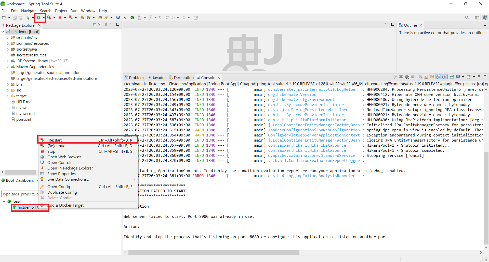 2) local의 프로젝트 서버 > 마우스 우클릭 > Restart로 서버 실행