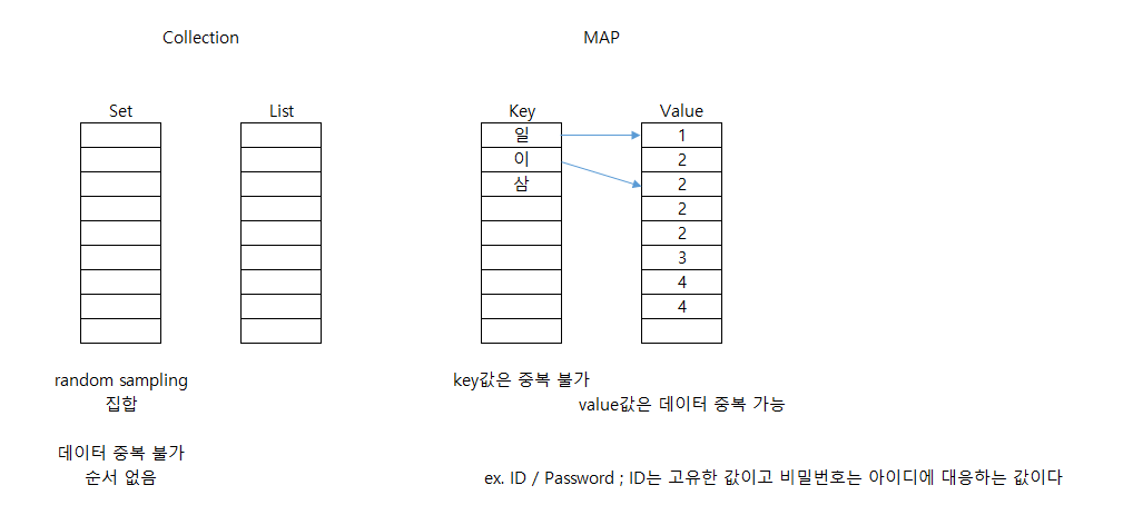 Key값은 중복금지, value는 중복 가능, 둘 다 순서는 유지되지 않는다