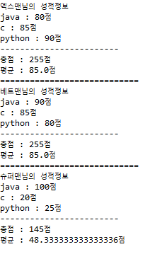 (합계, 평균 등이 제대로 나오도록 아래의 객체를 생성 후 정보 출력)