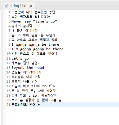 String text = "어둠만이 나의 전부였던 동안\r\n"