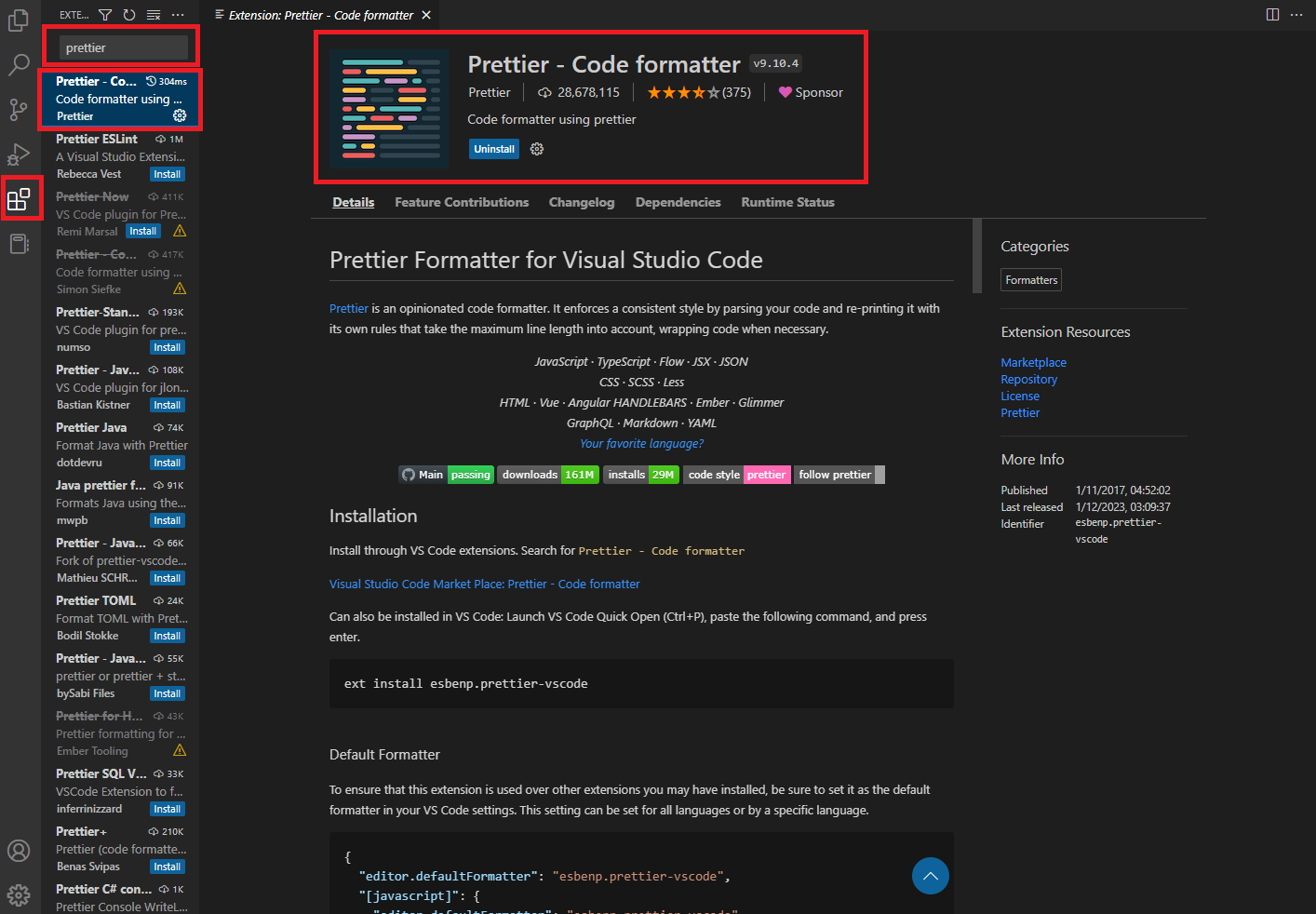 검색창에 code formatter 검색 > None에서 Preetier - Code formatter로 적용