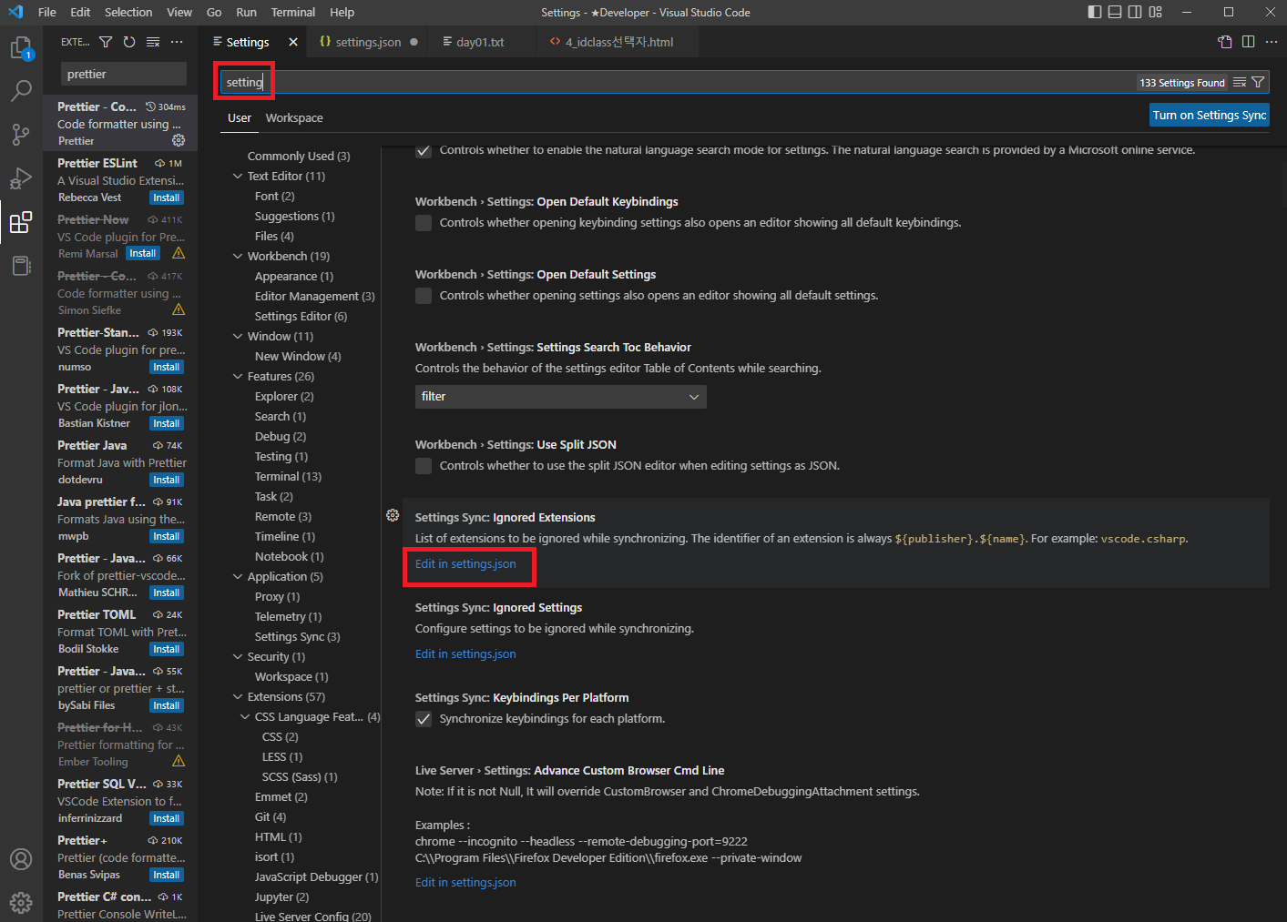 File(파일) > Preferences(기본설정) > Settings(세팅) > 검색창에 setting 검색 > Edit in setting.json(json에서 편집)