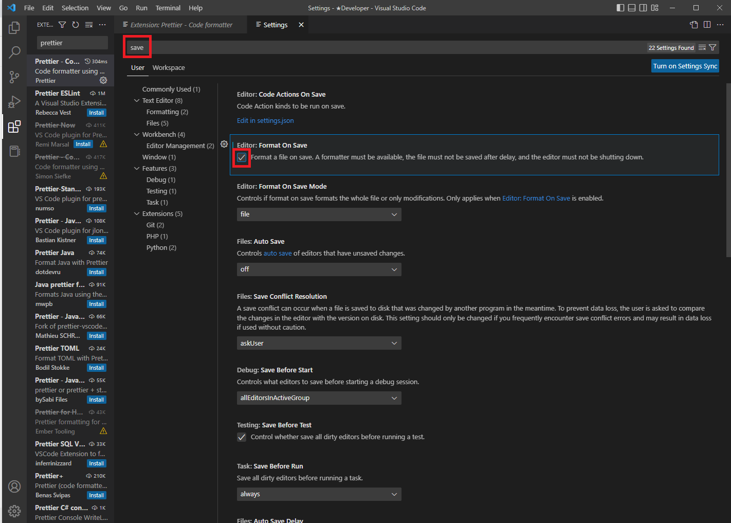 save 검색 > Format On Save 체크표시