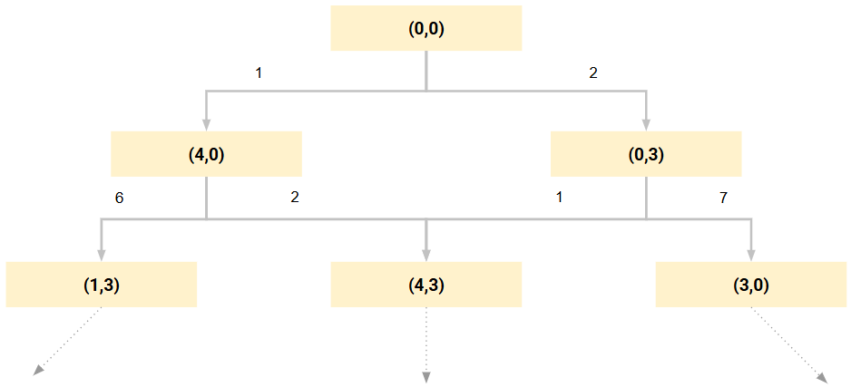 | 7 | (x, y), x+y<4 and y>0 | (x+y, 0) | 3리터들이 물병에 남은 물을 4리터들이 물병에 모두 옮김 |