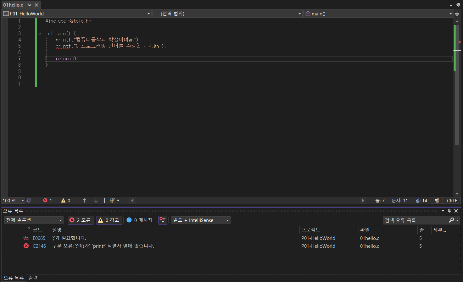 * 구문 오류: 문법에 어긋난 잘못을 말하며 소스를 편집하다 보면 ;나 " ", < >, ( ), { } 등의 구두 문자를 빠뜨리거나 printf나 puts 등의 단어를 잘못써서 발생하는 구문 오류(syntax error)는 흔하게 발생