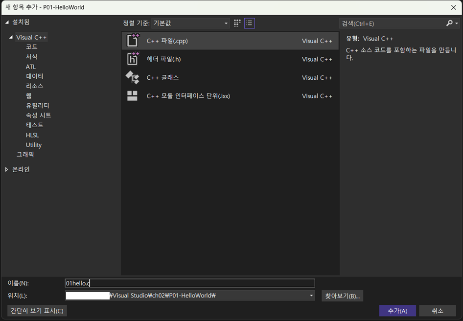 - 대화상자 > 새 항목 추가 > Visual C++ / C++ 파일(.cpp)