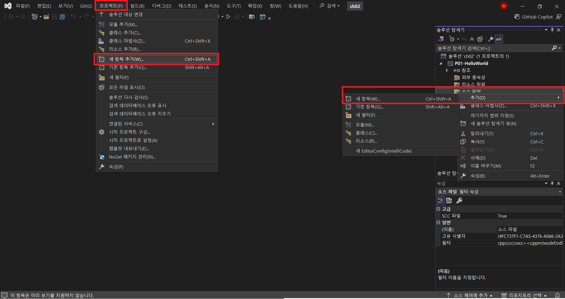 - 솔루션 탐색기 > 소스 파일 > 추가 > 새 항목