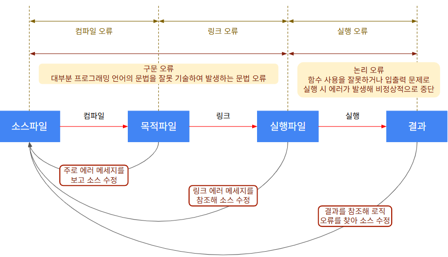 : 컴파일과 링크, 실행 시 오류가 발생: 대부분 소스 코드 수정 후 다시 컴파일, 링크, 실행