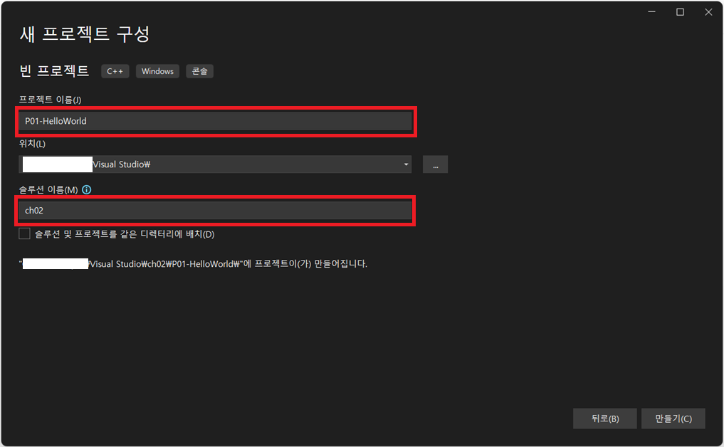 1) 임의로 지정된 프로젝트 이름과 위치, 그리고 솔루션