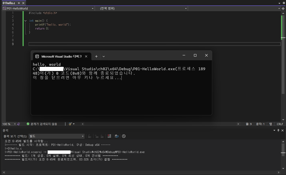 - [출력]에 빌드 과정 표시: 마지막 줄에 성공1, 실패0으로 표시