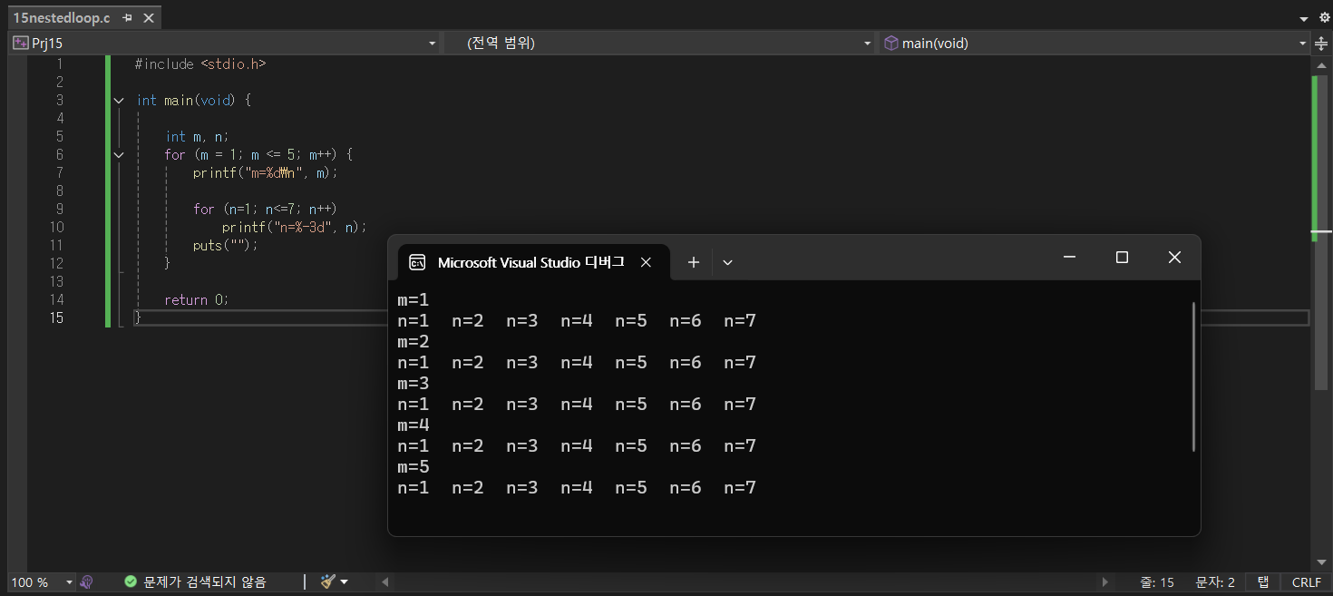 - 외부 for문의 제어 변수는 m, 내부 for문의 제어 변수는 n