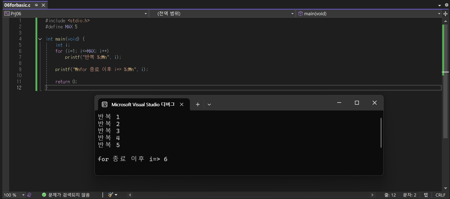 - 조건식 i<=MAX는 전처리 수행 후 MAX가 5로 대체되어 i<=5가 되므로, i가 5보다 큰 6이 되는 경우 조건식이 거짓이 되어 반복 종료