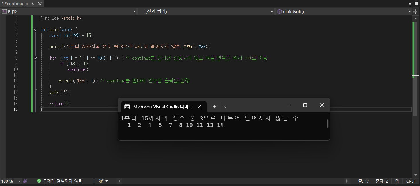 - continue이후의 반복몸체를 실행하지 않고 조건문으로 이동