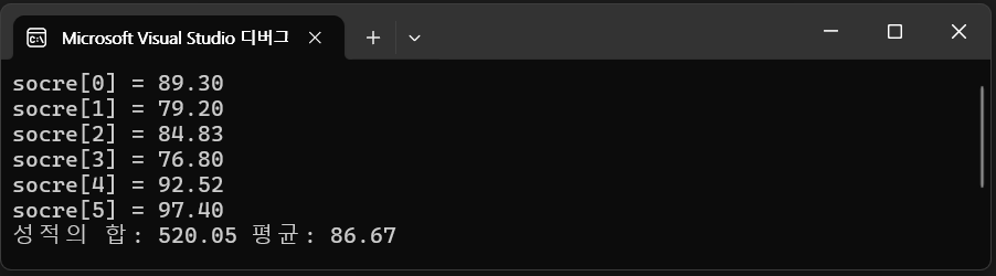 - 배열원소는 5개이므로 score[5]로 참조 불가
