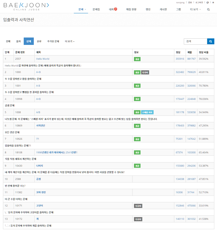 단계별은 @jh05013님이 관리하고 계십니다. 단계제목설명정보총 문제내가 맞은 문제1입출력과 사칙연산입력, 출력과 사칙연산을 연습해 봅시다. Hello World!132조건문if 등의 조건문을 사용해 봅시다