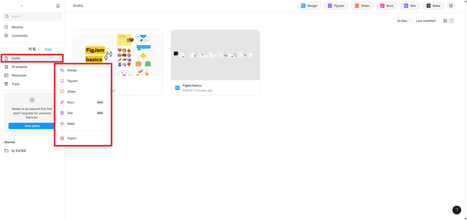중앙 아래: 피그마로 만들 수 있는 작업창
