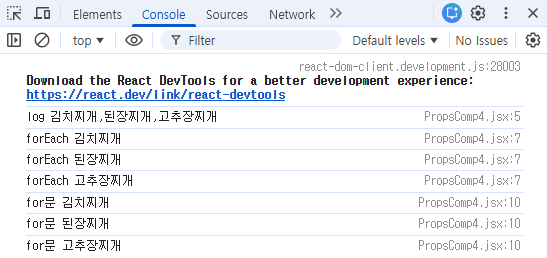 | foodList를 PropsComponent4.jsx 파일을 만들어 Props로 값을 넘기고, 콘솔에 모든 값을 하나씩 출력하기 |