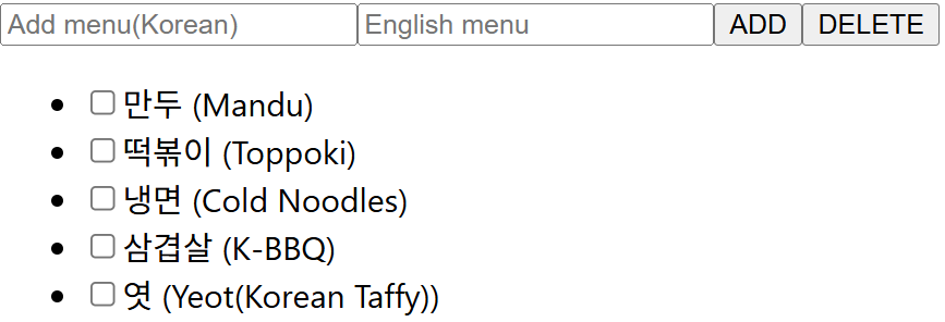 | 사용자가 음식명을 국문/영문으로 입력하고 추가 버튼을 누르면 추가 각 메뉴는 체크박스 형태로 화면에 출력 사용자가 체크박스에 체크해 삭제버튼을 누르면 선택한 항목이 삭제된다 |