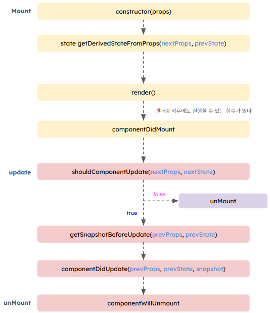 - 페이지에 컴포넌트가 생성되고, 수정되고, 사라지는 순서를 의미