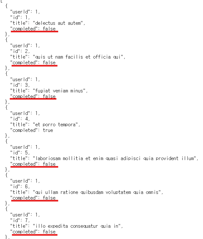 -> 테스트 데이터에서 completed 상태가 false인 항목의 title을 출력해야 한다