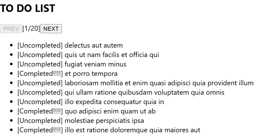 | jsonplaceholder에서 데이터를 요청해 화면에 완료하지 못한 할일 목록 중 제목만 li 태그로 출력하기 https://jsonplaceholder.typicode.com/todos/ |